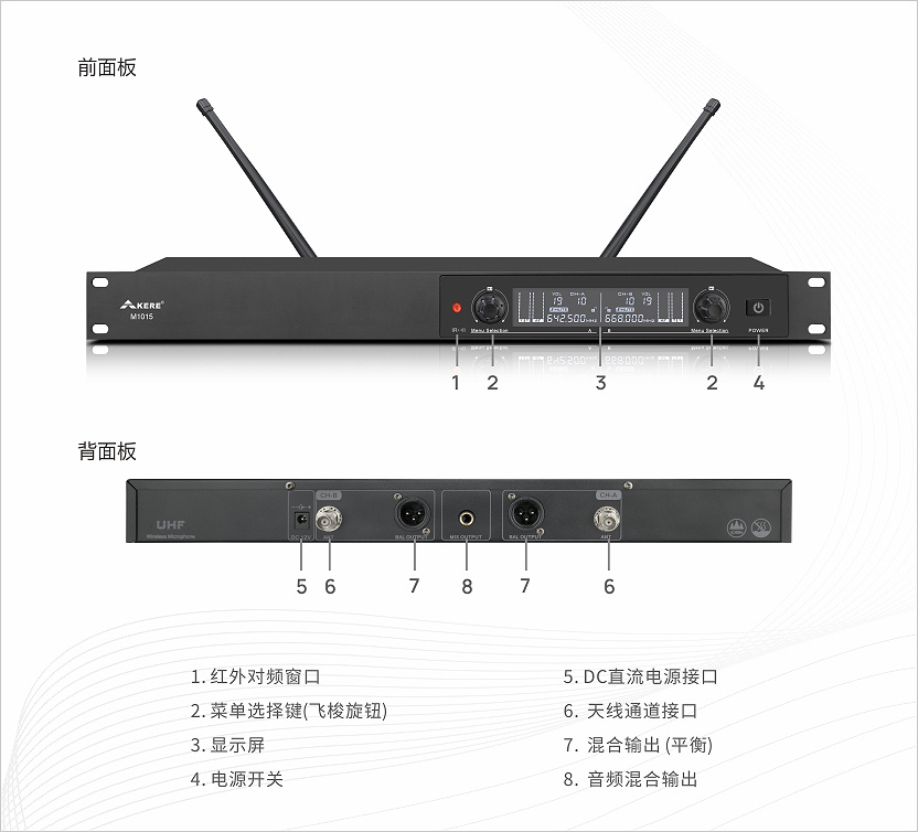• A/B通道独立输出采用国际标准的XRL卡侬接口,混合输出采用TRS(6.3mm)二芯接口接收机参数: